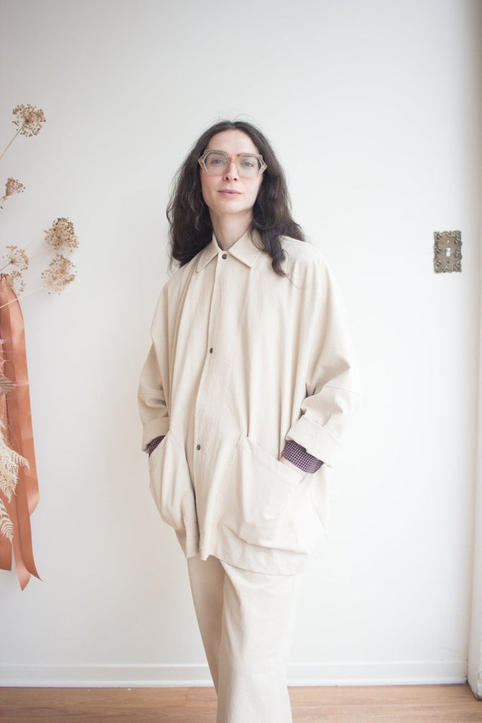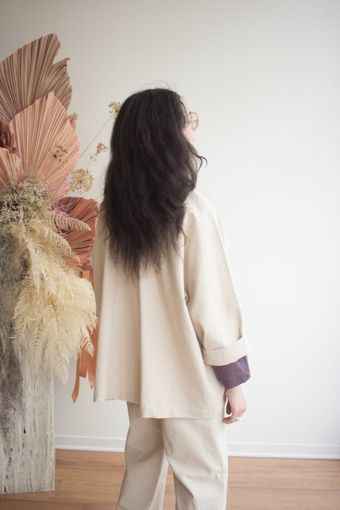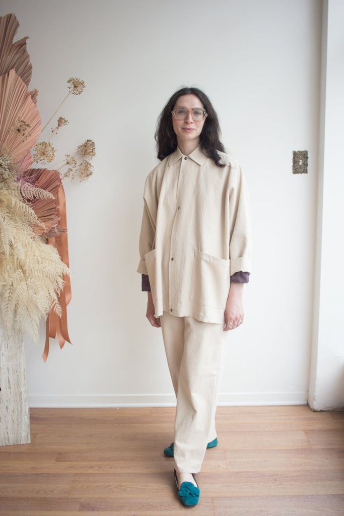 The Column Pants from Devlyn van Loon are a versatile straight-cut pant made in a beautiful deadstock cotton. The relaxed cut and elastic waist provide comfort and an unbeatable ease of wear while still providing an elevated style. The fabric of this pant is durable without feeling overbearing, giving it a seasonless appeal that will serve you well time and time again.
