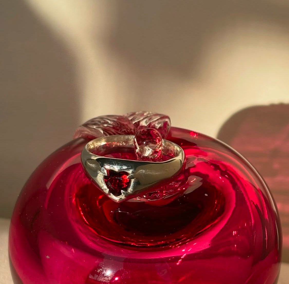 A rich red heart shaped garnet set in a smooth solid sterling silver band.