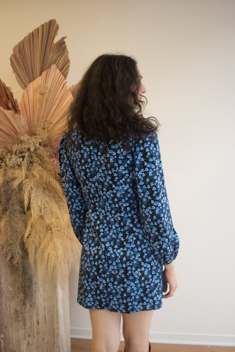 The Birds of North America Nyctale Dress is just the sweetest! This piece is a 60’s inspired cotton printed dress with a stand-up collar, full sleeves that gather into a cuff, and pockets on the skirt. It closes with a back invisible zipper and the skirt is lined in cotton voile.T his magical print features luminescent blue mushrooms on a starry-sky black background. To make this dress even more special, the caps of the mushrooms and the stars actually glow in the dark!