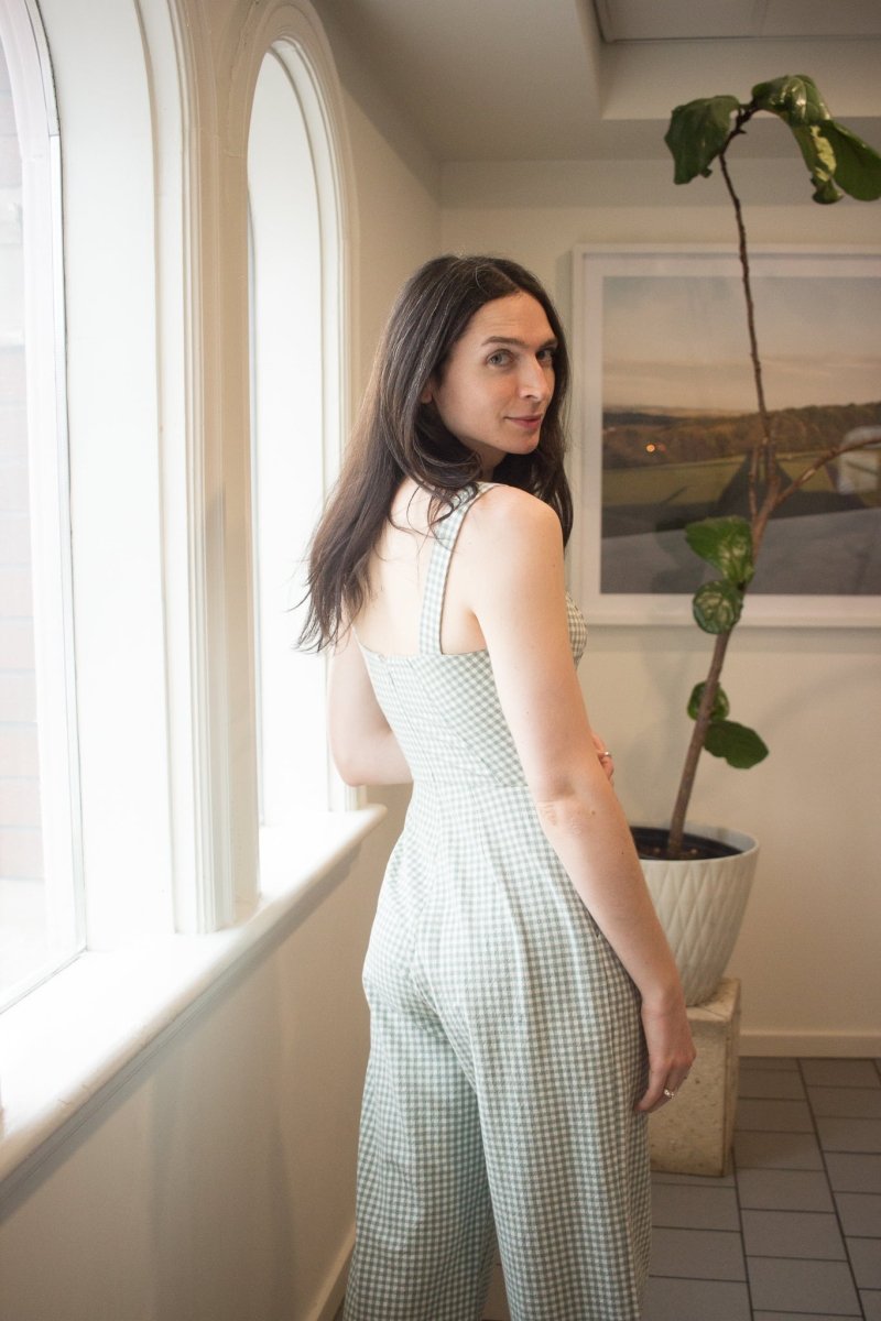 The Roadrunner Jumpsuit by Birds of North America is a tailored, wide leg jumpsuit that's made of medium-weight, organic cotton gingham. It has playful directional gingham details on the top, as well as the front pockets. The neckline is faced, and it closes with a back invisible zipper.