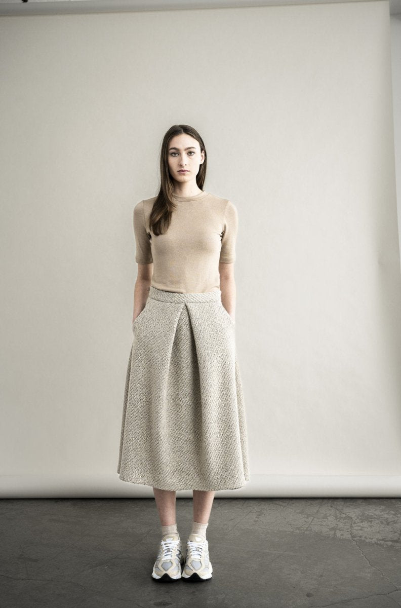 Bodybag by Jude's Highland Skirt is a substantial yet soft midi tweed skirt featuring a dramatic pleat at middle front and integrated side seam pockets. The Highland is fully lined and closes at the back via a metal zipper with a branded leather embossed pull tab. The heavy weight of this beautiful skirt lends itself to having a lovely drape and feel on the body. It sits at the waist making it perfect to pair with a tucked in fitted long sleeve or a cozy chunky knit sweater for those cooler days. The Highland Skirt is a wardrobe essential for those looking to look effortlessly chic and keep warm during the colder months!