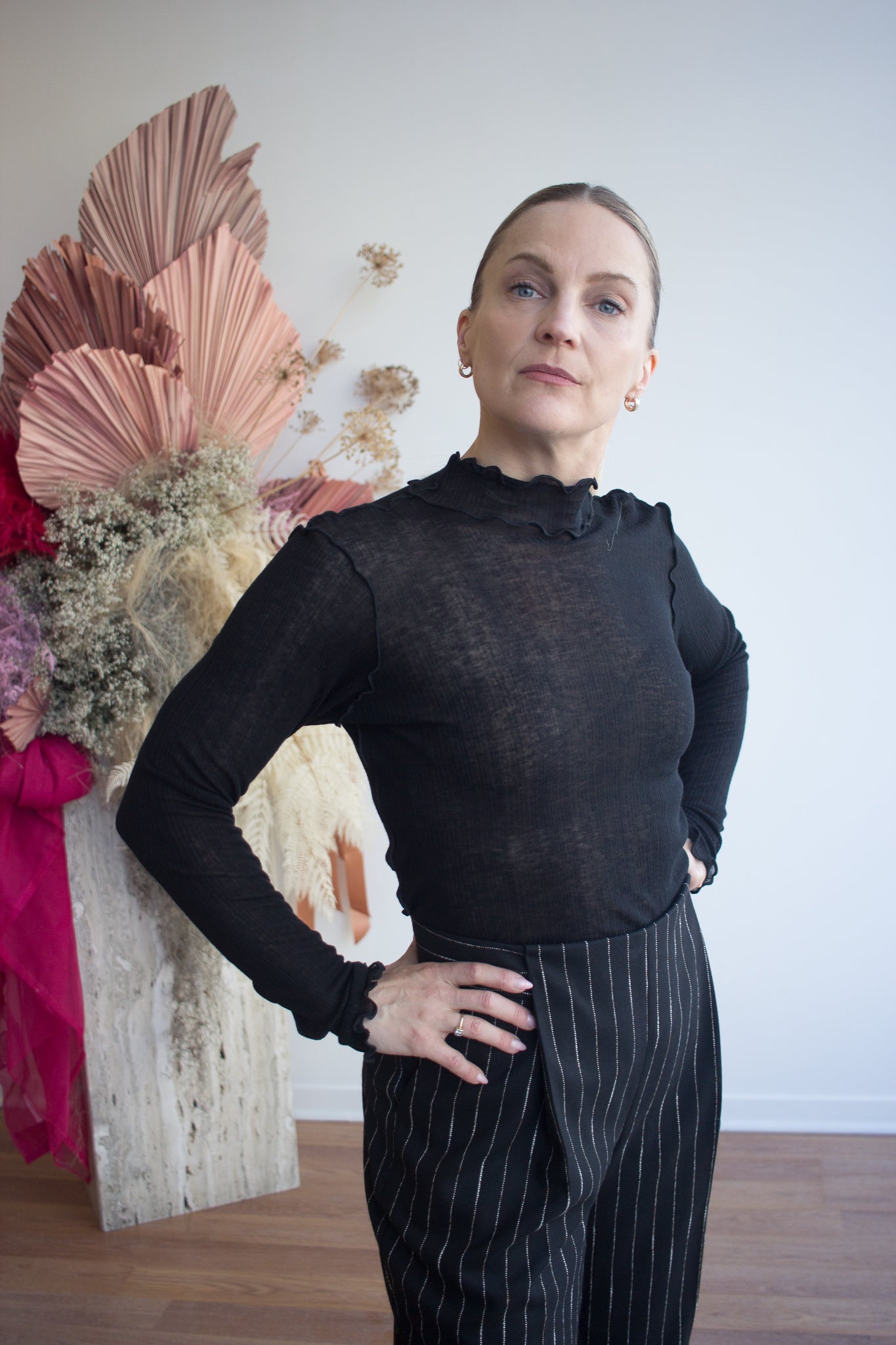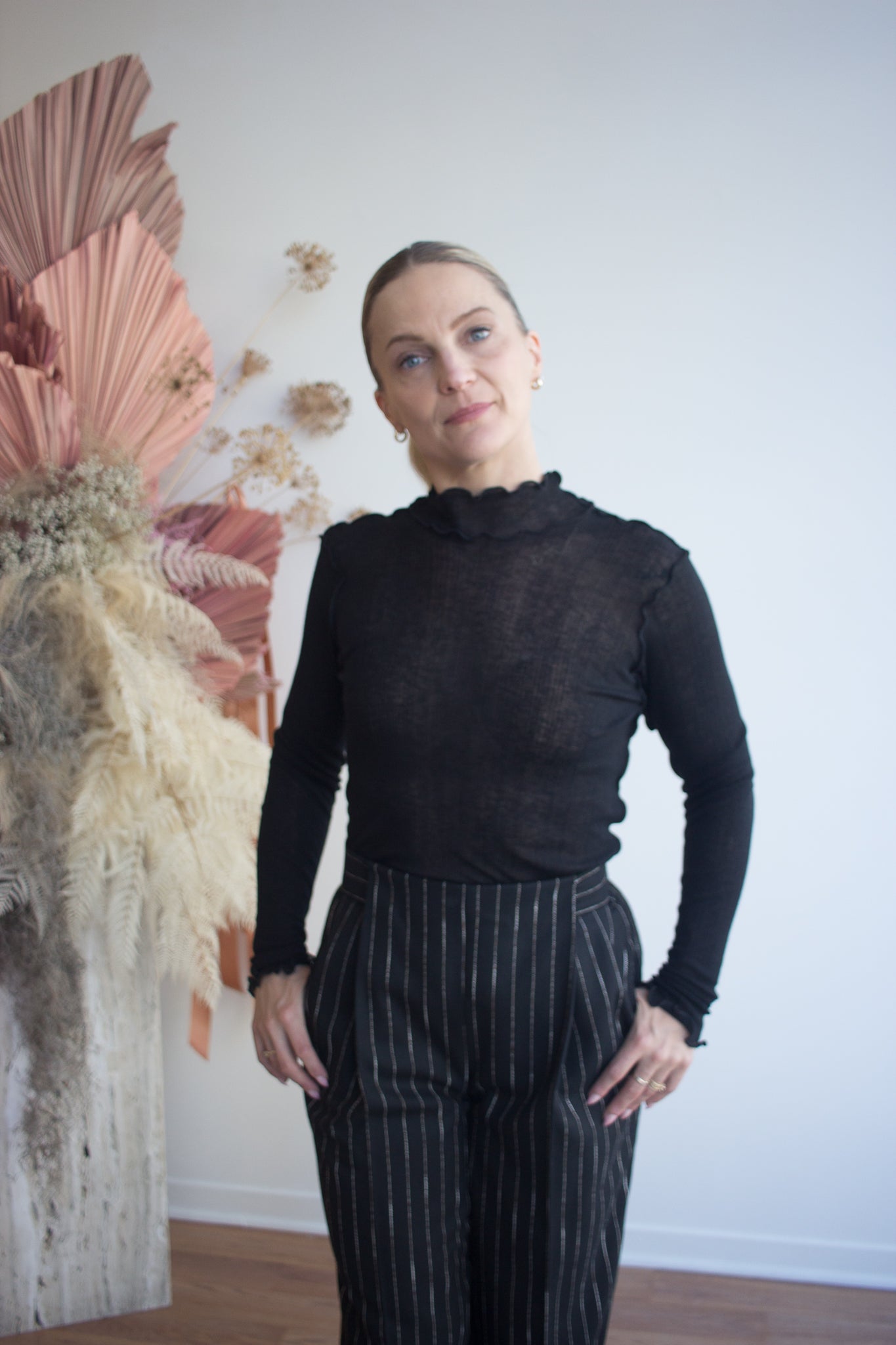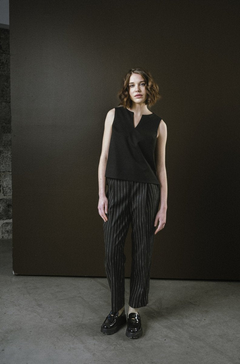 The Regent Trousers by Bodybag by Jude are a classic pinstripe trouser with a carrot leg and high waist. Featuring front pleats, integrated side seam pockets, and beautiful metallic golden pinstripes running down the length of the pants. Pair the Regent Trousers with a black loafer and a fitted blouse for a classy and modern work-wear fit!