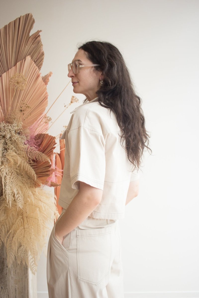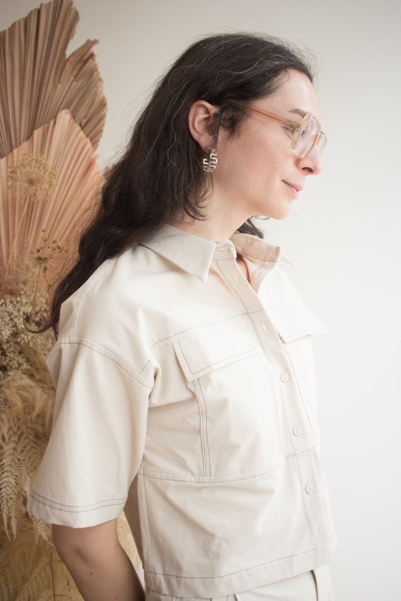 Eve Gravel's Iris top is a cropped, loose-fitting shirt with short sleeves in a structured fabric to accentuate its boxy side. It has two chest pockets, contrast stitching and elegant cutouts that add an extra touch of sophistication.