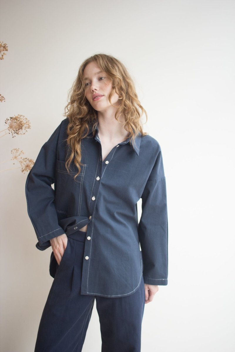 The Eve Gravel Malabou shirt is a relaxed, generously cut shirt featuring a single chest pocket on the right side. A longtime essential in Eve's lineup and a go-to season after season, this dark denim marine colour is the perfect staple. This edition features bold contrast stitching in white and a curved hem, bringing a subtle yet contemporary update to this classic piece.