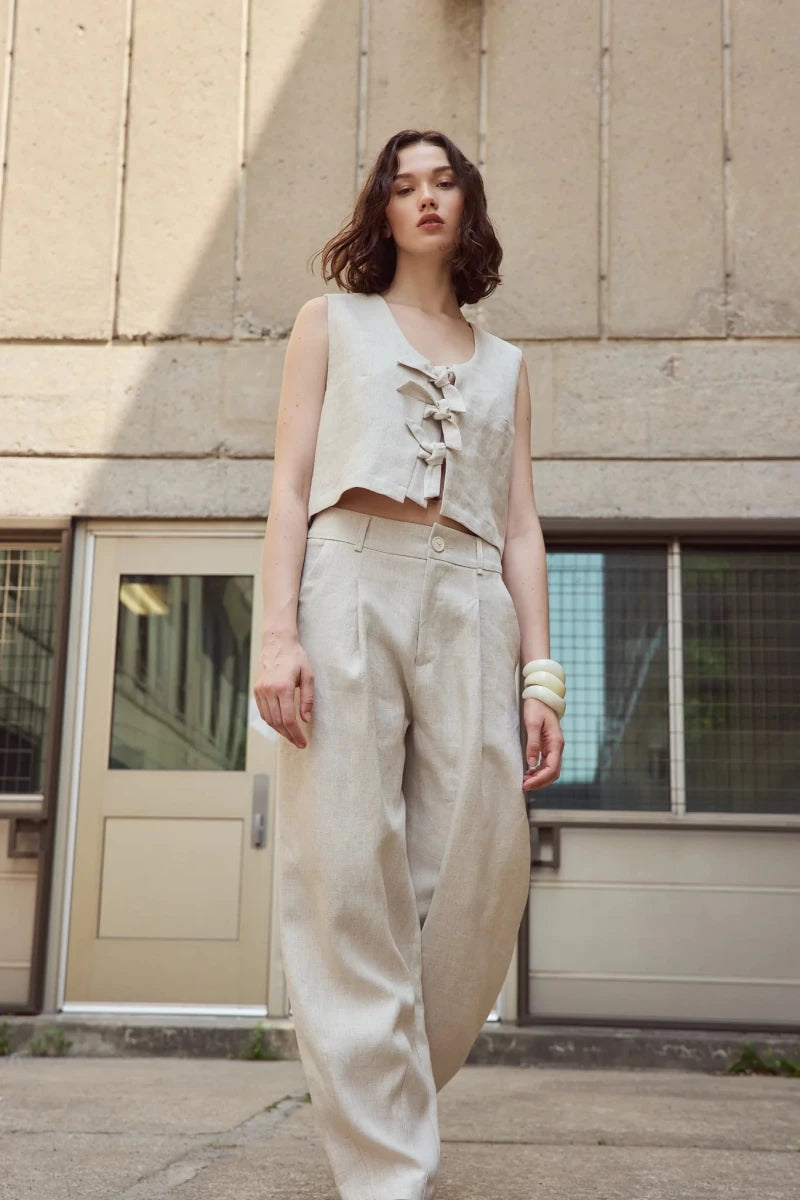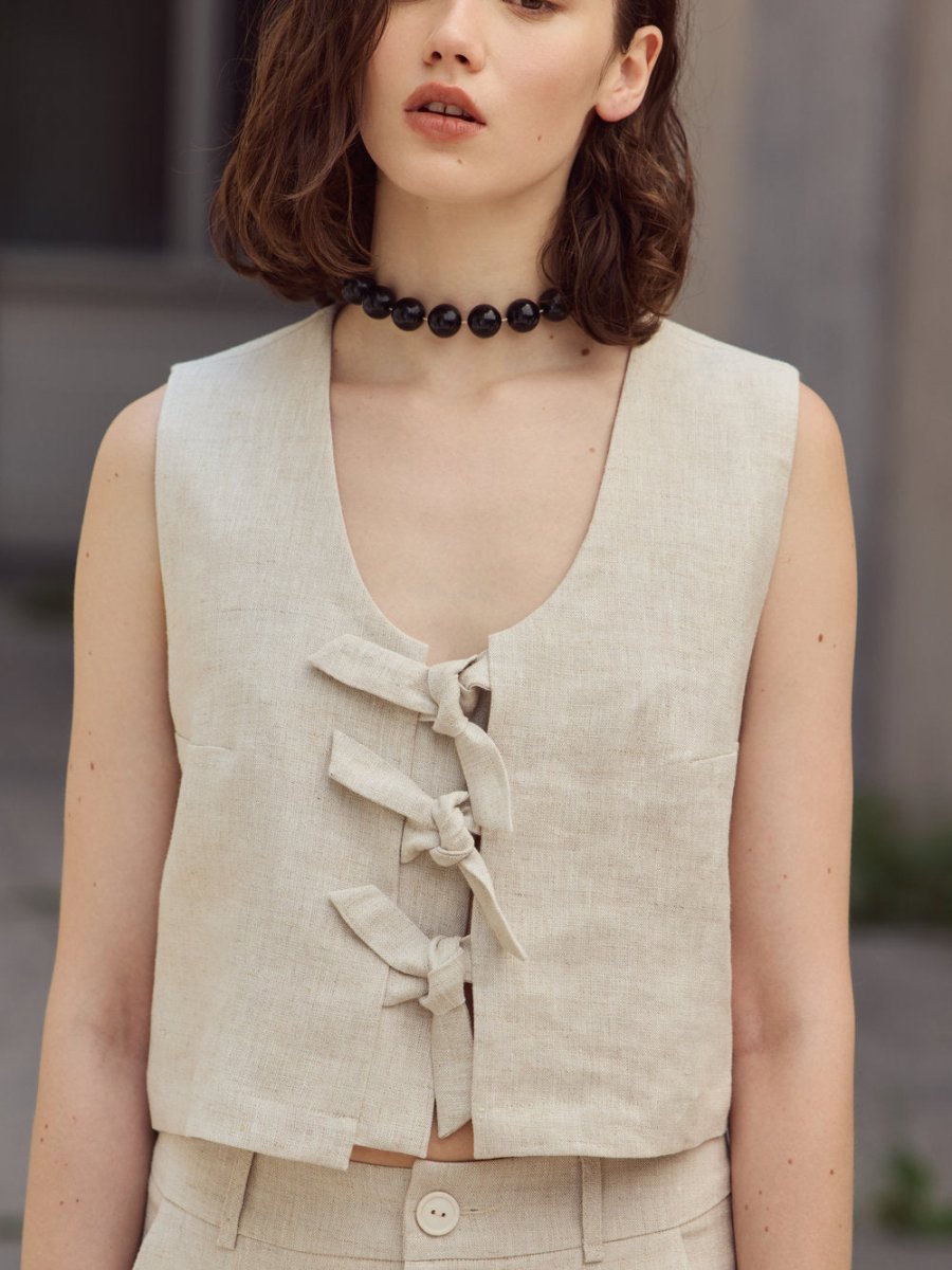 The Saxon Vest by Eve Gravel is distinguished by its three knots on the front and an under tap to hide the skin, an original and delicate closure.