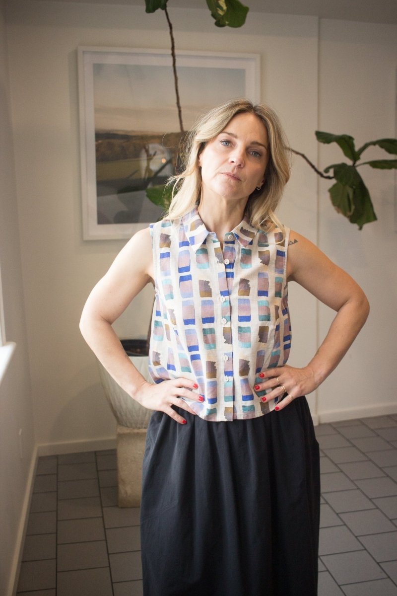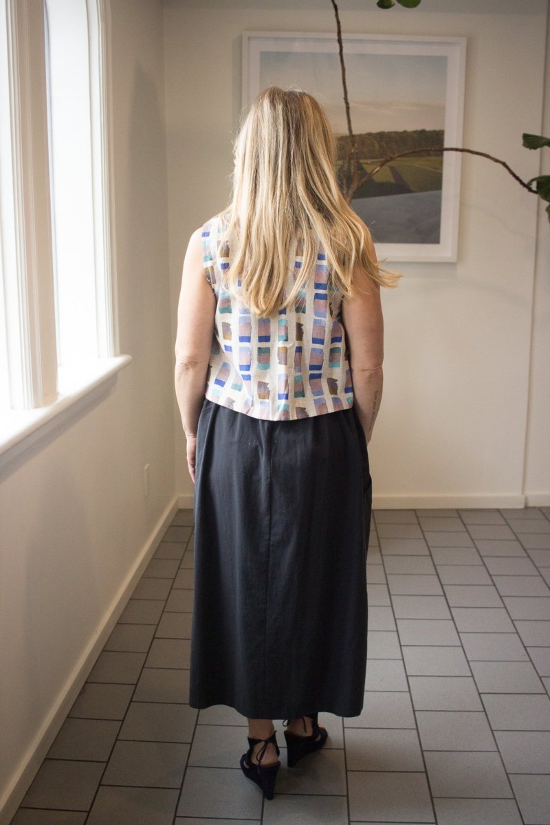 The Cyrene Skirt by Jennifer Glasgow is a voluminous skirt featuring soft gathers at the waist and cleverly designed geometric seams with integrated pockets. Made from crinkled, breathable cotton, it has a straight waistband with elastic tabs at the back for added comfort and an invisible side zipper for a clean finish. The Cyrene Skirt