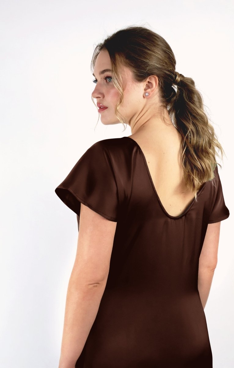 The Aurora Dress by Korelli is a reversible maxi dress-- a two for one dress! One side features a subtle bateau neckline, and the other, a more pronounced neckline for a bolder style. The draped short sleeves provide comfort and lightness. The "Goethe" side features a slightly flared cut, creating a fluid and feminine silhouette. Crafted from a smooth, lightweight, and wrinkle-resistant polyester satin fabric with a beautiful sheen, this versatile dress is ideal for a variety of occasions, combining elegance and practicality in one ingenious design.