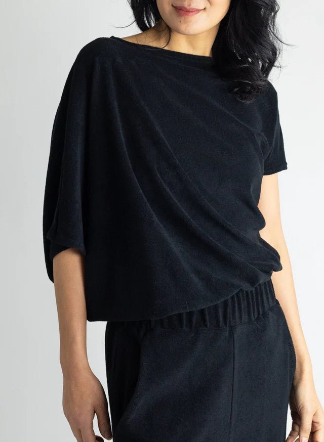 The 80's Tee by Meg is a retro inspired blouse with a relaxed and casual fit. Featuring a wide boatneck neckline with elastic around the hem, allowing for the perfect off the shoulder look, complete with billowy dolman sleeves. The 80's Tee is made from a soft terry cloth hand-feel!