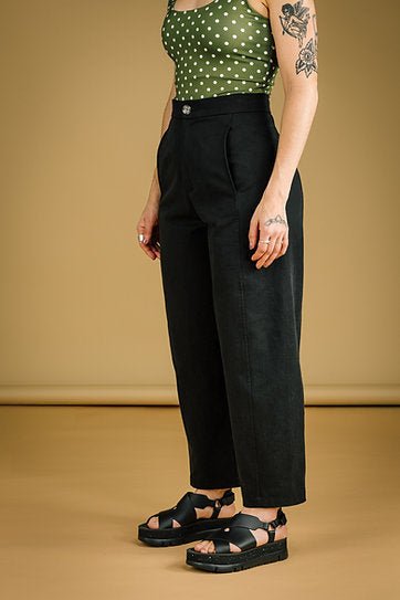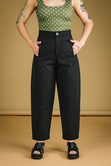 Mercedes Morin has designed a workhorse piece with her new Barrel pants. These pants have a timeless utilitarian look with details that feel modern and fresh! These pants have a structured shape with added stretch to ensure comfort throughout the day. Hidden side pockets effortlessly blend into the front seams of these pants, giving them an elevated feel that can be dressed up or down with ease.