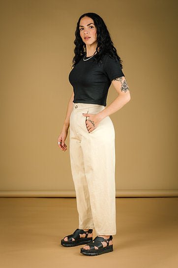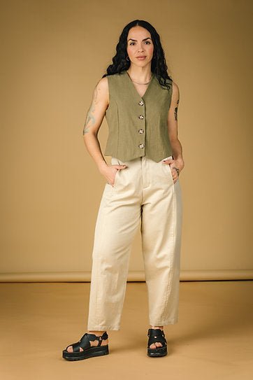 Mercedes Morin has designed a workhorse piece with her new Barrel pants. These pants have a timeless utilitarian look with details that feel modern and fresh! These pants have a structured shape with added stretch to ensure comfort throughout the day. Hidden side pockets effortlessly blend into the front seams of these pants, giving them an elevated feel that can be dressed up or down with ease.