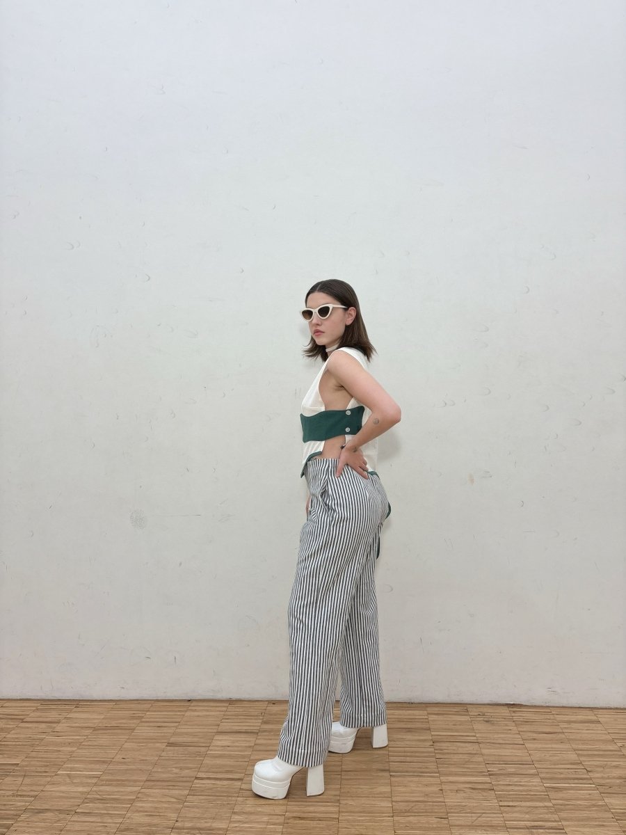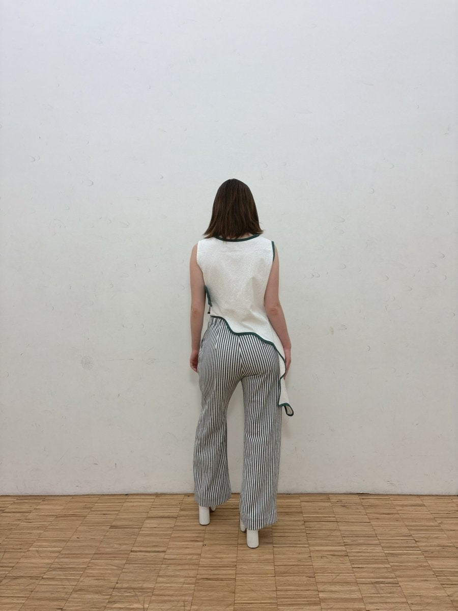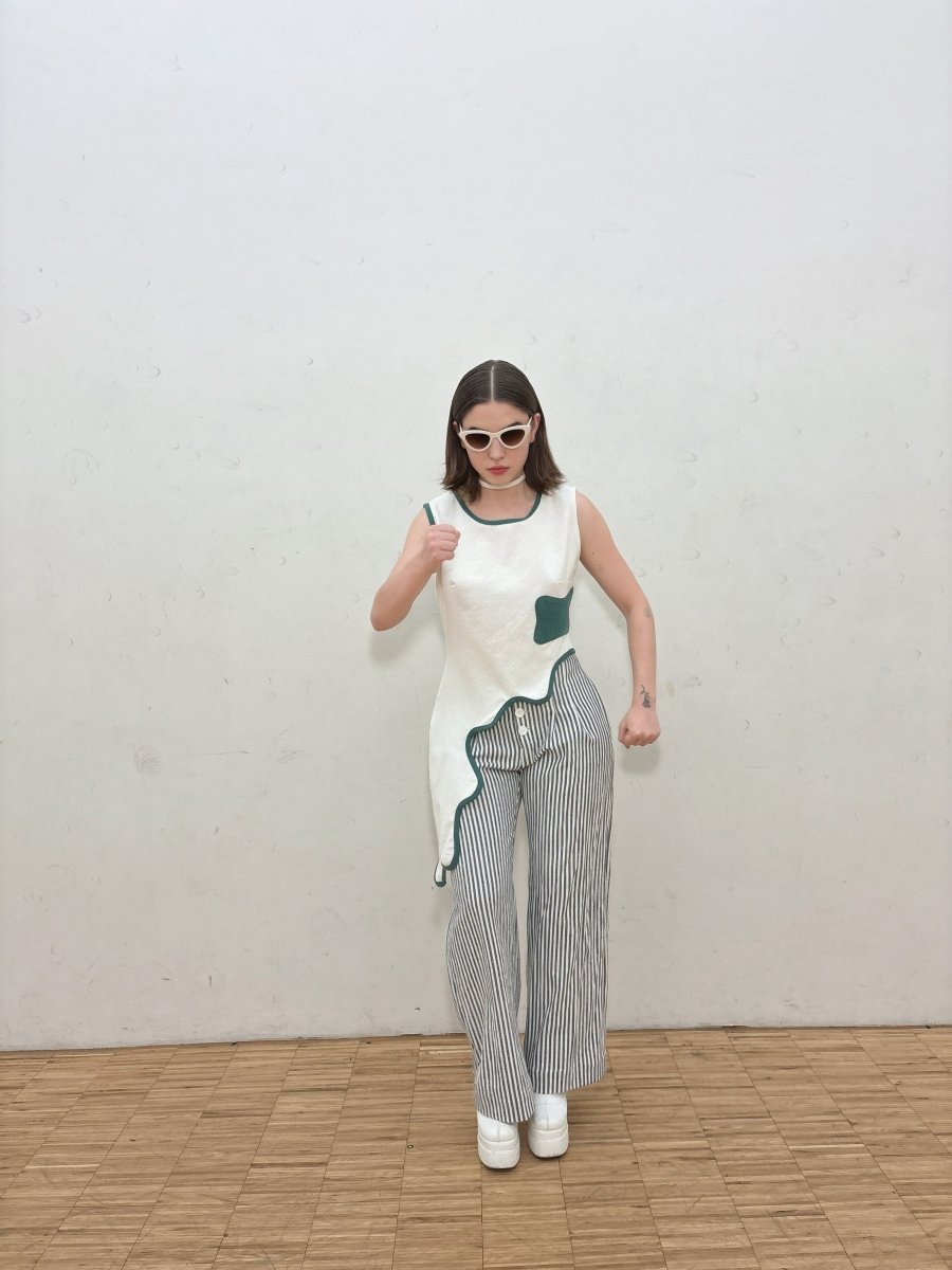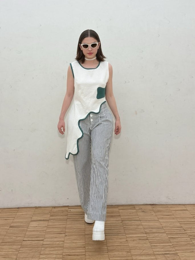 Striking, playful, and full of personality! The Tidalwave Shirt by Rennie transforms movement into design. Featuring a sculptural wavy hem and bold contrast edging, this piece brings an artistic edge to everyday dressing. The asymmetrical silhouette adds fluidity and interest, creating a look thatfeels both effortless and intentional. Designed with a structured waistband and button closure, this top offers a secure, polished fit that balances its organic lines. The contrast bias binding highlights every curve of the wave,