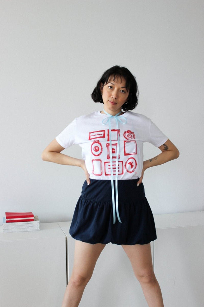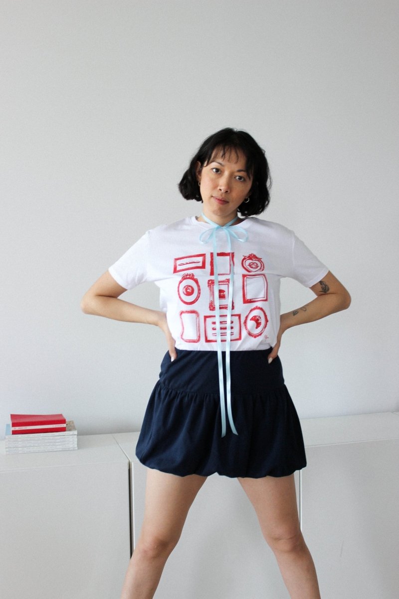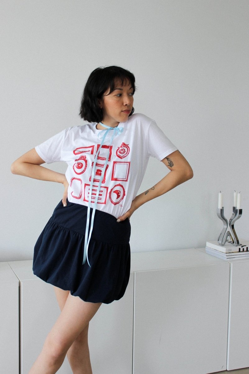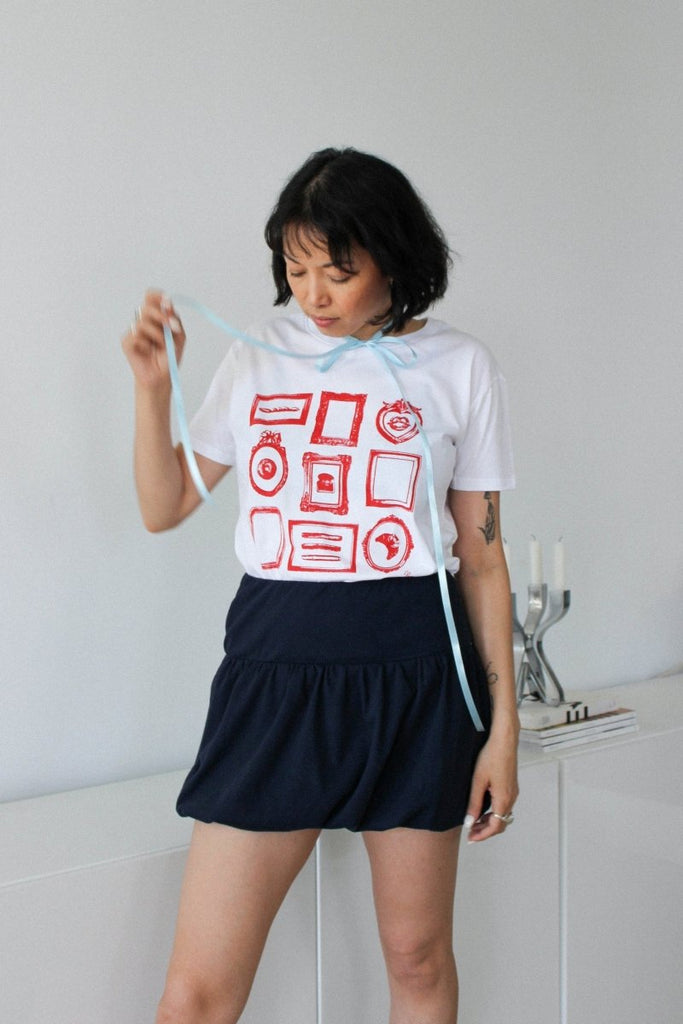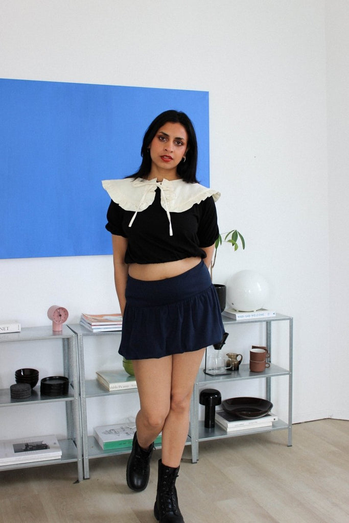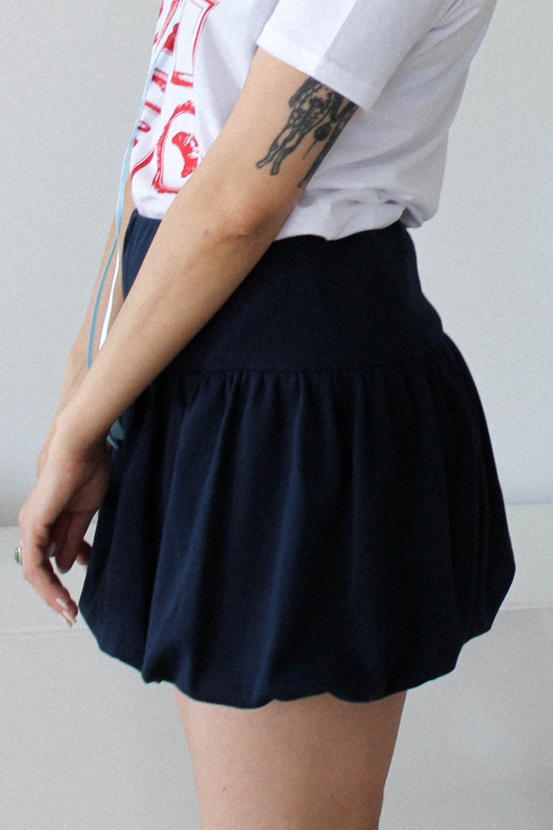 The Tidal bubble miniskirt is playful, voluminous, and comfortable thanks to its navy blue cotton and spandex make up. Lined with a lightweight, satin-like material, the Tidal bubble miniskirt was inspired by Nini's wardrobe during the early 2000's, which consisted of keyhole floral tees and made-by-mom bubble skirts.